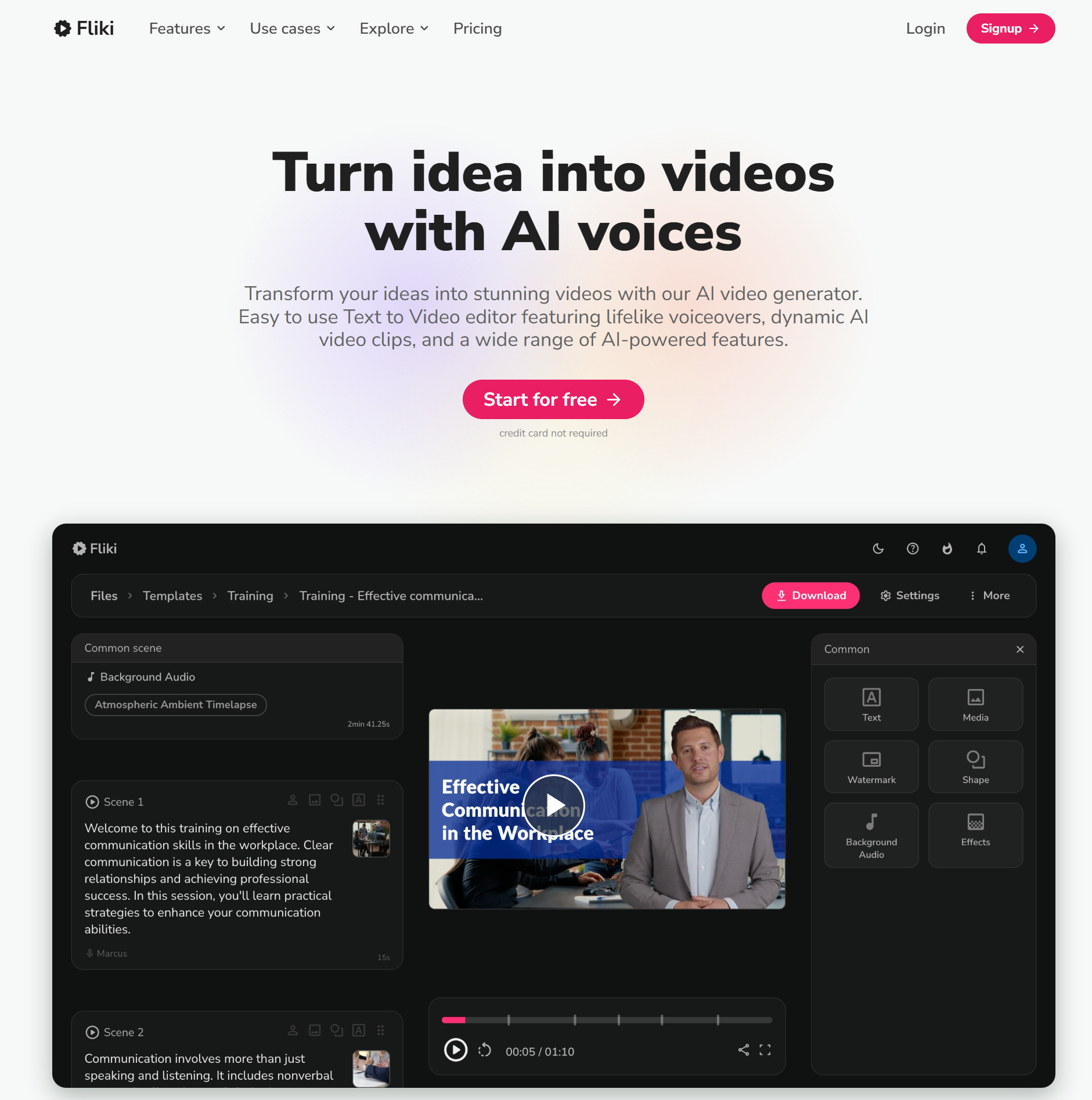 Transform your ideas into stunning videos with our AI video generator. Easy to use Text to Video editor featuring lifelike voiceovers, dynamic AI video clips, and a wide range of AI-powered features.